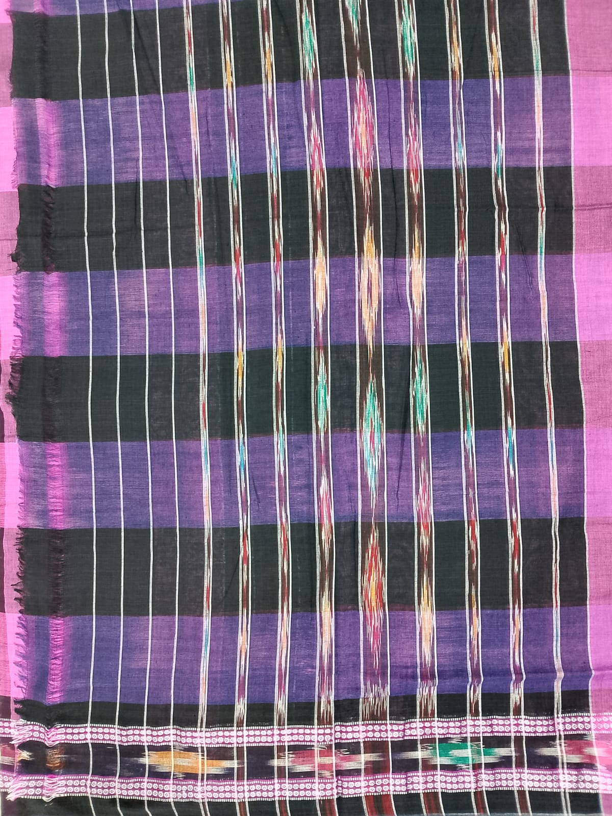 The motifs of the Sambalpur CottonSaree are unique, featuring auspicious elephants symbolizing wisdom and prosperity, trailing vines that signify fertility, vibrant peacocks representing grace, large multi-petaled flowers, and mythological figures like the Nabagunjar, a symbolic animal unique to Odisha’s culture. Some designs also showcase the deula kumbha, symbolizing temple spires, reinforcing the saree’s sacred roots. Unlike many ikat weaves of Odisha, Khandua sarees have simpler plain borders, setting them apart while retaining elegance.